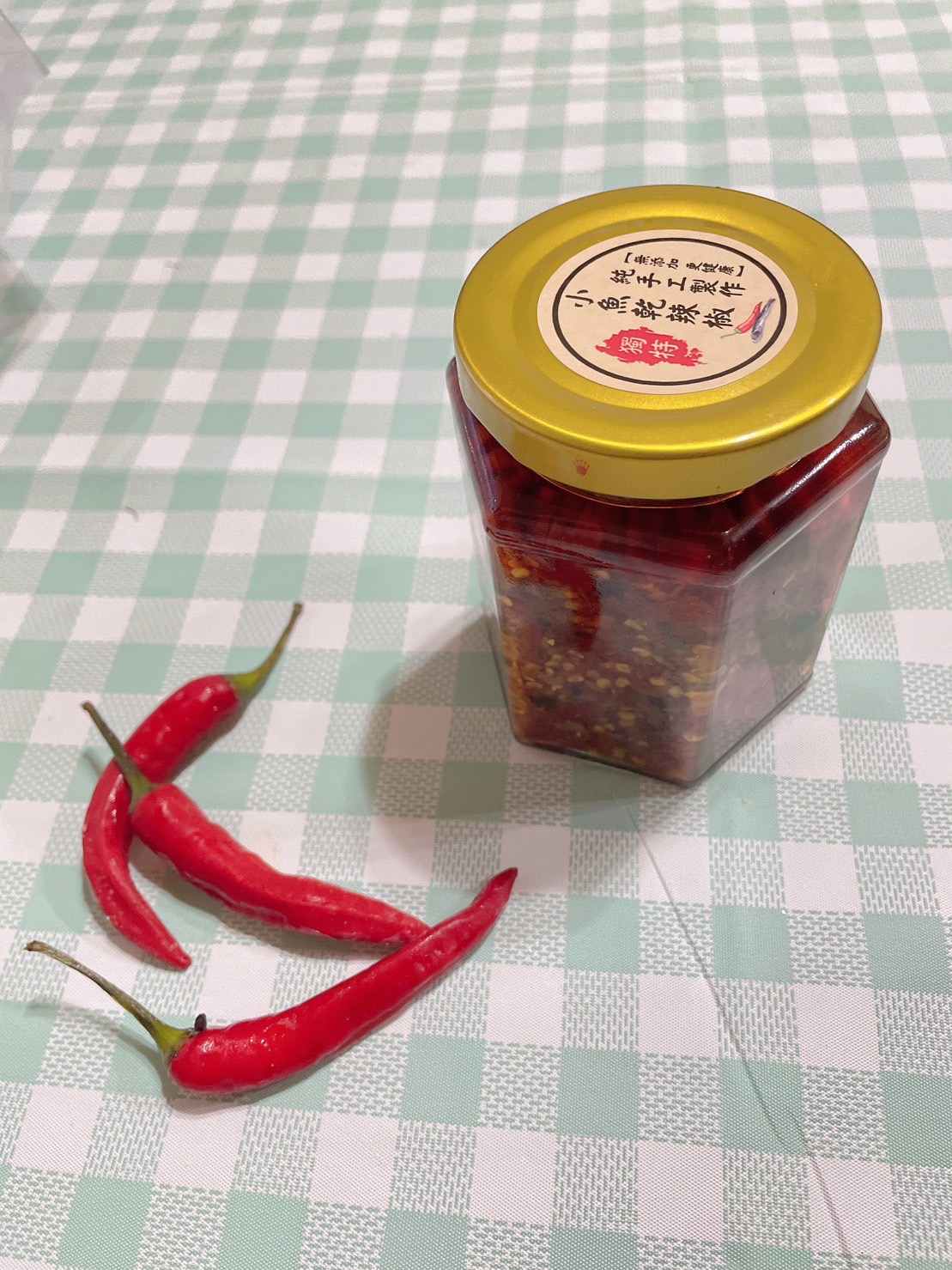 內容物:沙拉油、辣椒、小魚乾、豆鼓、蒜、醬油、糖、香油。